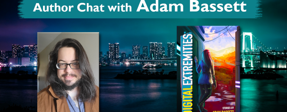 Author Chat with Adam Bassett, headshot of Adam (long dark hair, glasses), and the cover of DIGITAL EXTREMITIES (cyberpunk girl leans out of doorway, stairs into countryside)