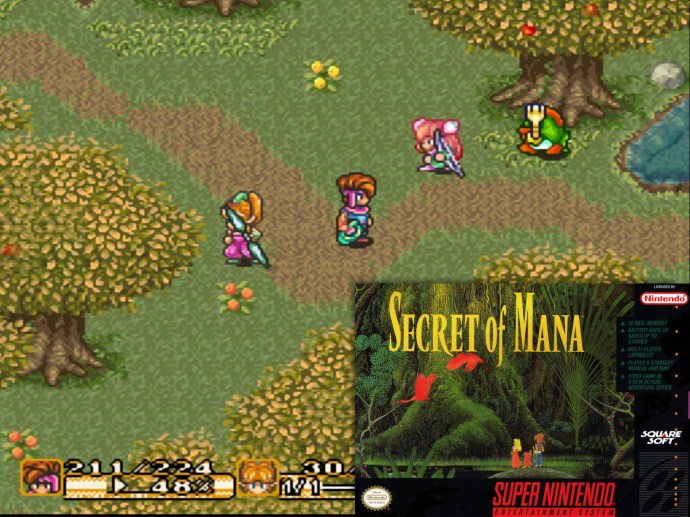 SECRET OF MANA (1993) is a Zelda-esque adventure where three companions—a chosen one farm boy, an amnesiac last-of-his-kind fairy boy, and a runaway noble girl avoiding an arranged marriage—face their destiny, get a magic sword, and defeat an evil empire. As is tradition.