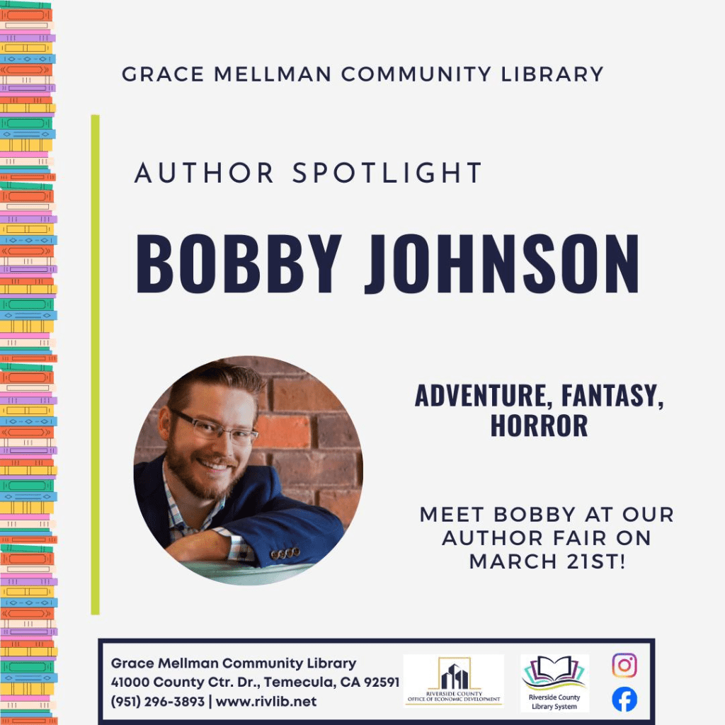 Hey y’all! Quick announcement: for any folks in the area, I have a booth at the Grace Mellman Community Library Book Fair this Saturday (March 21st). So come on down if you’re in or near Temecula this weekend.